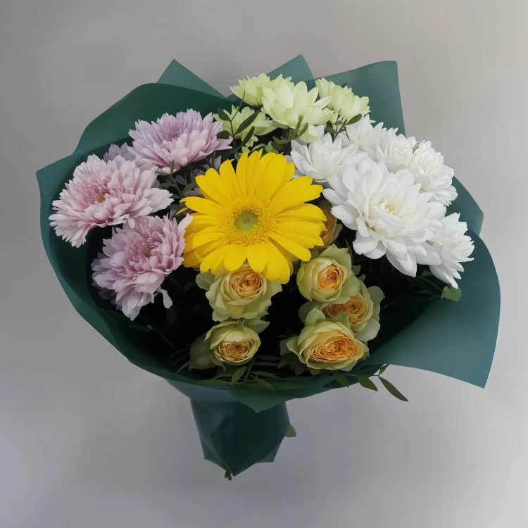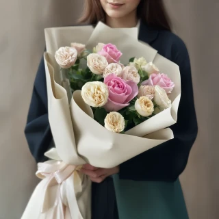 Этот потрясающий букет эмоций и нежности притягивает взгляд своей богатой палитрой чарующих оттенков и тонким ароматом. Кустовые розы, с изящно раскрывающимися пышными цветами, придают композиции игривость и легкость, а одноголовые розы добавляют изящества и элегантности. Каждый цветок является уникальным произведением искусства природы. Упаковка, украшенная изысканными деталями, подчеркивает драгоценность этого букета. Это настоящее проявление любви и заботы, идеальный подарок для особого случая или просто, чтобы подарить радость и улыбку.