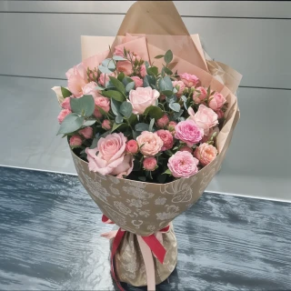 Этот великолепный букет представляет собой истинное произведение искусства. Сочетание одноголовых и кустовых роз в нежных розовых оттенках создает превосходное впечатление. Цветы, олицетворяющие любовь и романтику, выглядят особенно величественно благодаря крафтовой упаковке. Оригинальное сочетание форм и текстур добавляет изысканности этому букету, делая его незабываемым и запоминающимся подарком. Отправьте самые искренние эмоции и дарите этот букет, чтобы подчеркнуть важность человека в вашей жизни.