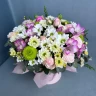 Эта элегантная шляпная коробка наполнена нежными розами, яркими альстромериями и великолепными хризантемами. Комбинация этих цветов создает неповторимое сочетание, которое идеально подойдет для особого случая или просто для того, чтобы порадовать близких своей красотой и изяществом. Нежные оттенки и изысканный дизайн этой композиции точно подчеркнут Вашу неповторимость и восхитят всех вокруг.